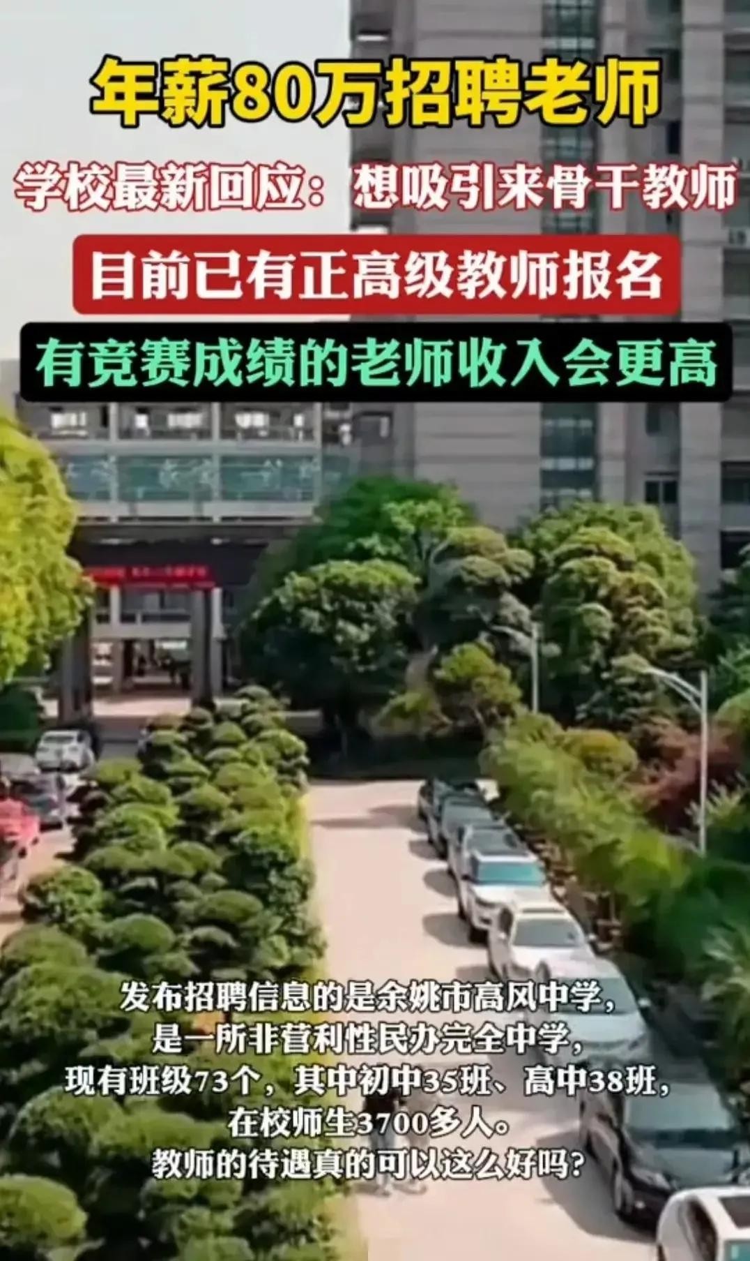 从视频中看到,所指的学校是余姚市高风中学。这所中学以3700名在校生、73个班级的规模,号称要打造“顶尖师资团队”。若按此价码配齐教师,一年仅特级教师工资支出便近6000万元,远超普通民办校的运营逻辑。
