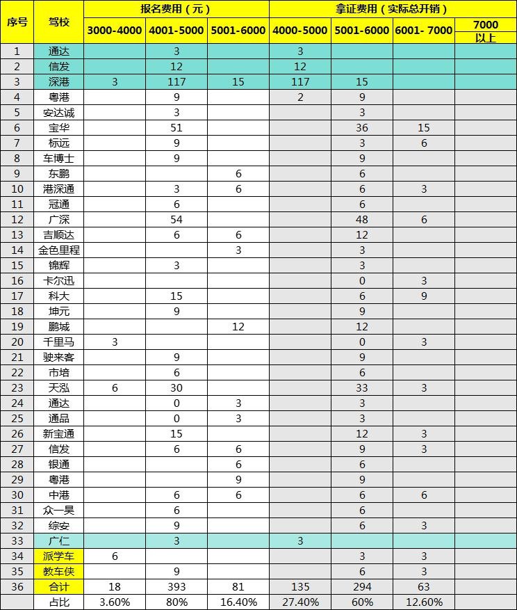 因此,根据这个市场调查,单从报名费和实际开销费用来看,可以发现深圳市宝藏驾校为深港驾校、通达驾校、信发驾校、广仁驾校,真正做到货真价实、一费到底、良心驾校。但从另外的角度来看,绝大部分驾校考取驾照费用在5000-6000之间,也说明一个问题,深圳各方面成本很高,再怎么低的学费,最终也要花到5000多元,做生意无利不起早,没有人会做亏本生意。只不过规范的驾校4000多报名费,明码标价,薄利多销,而挂靠教练为了招生,低价报名,后续有很多变相收费,每月招五六人,每人不多收一两千元,根本无法生存。如此说来,也不难理解驾培市场价格混乱了。