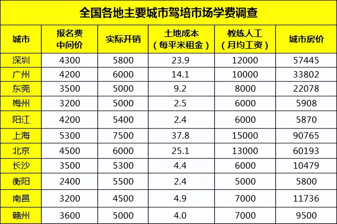 与全国各地的学费对比,你会发现深圳报名费真的低,北上广的实际溢出达1500元,但深圳才1000元,而且深圳的土地成本、人工成本和房价高,一个三五千平米的训练场一年租金动辄几百万,就算如此,在深圳学车也是比较划算的,全国主要城市驾考学费调查如下表所示: