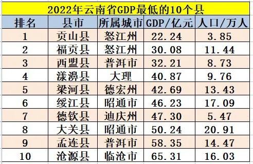 根据2022年的GDP数据,云南省GDP最低的10个县分别是贡山县(22.24亿)、福贡县(390.08亿)、西盟县(32.21亿)、漾濞县(40.87亿)、梁河县(42.69亿)、绥江县(46.23亿)、德钦县(47.30亿)、大关县(50.24亿)、孟连县(58.35亿)、沧源县(65.31亿)。