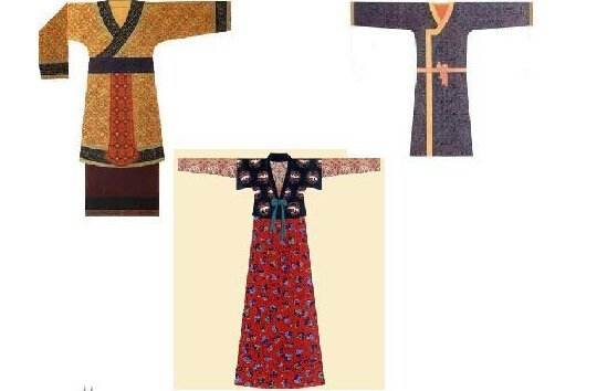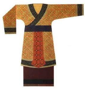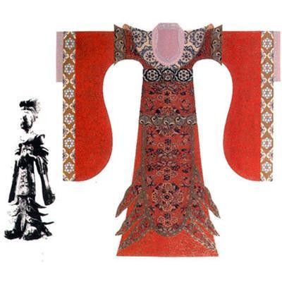 衣服:交领右衽长袖有华饰的大衣,衣长及足。配以宽腰带,上窄下宽形蔽膝,鞋履。是为高级贵妇之服。