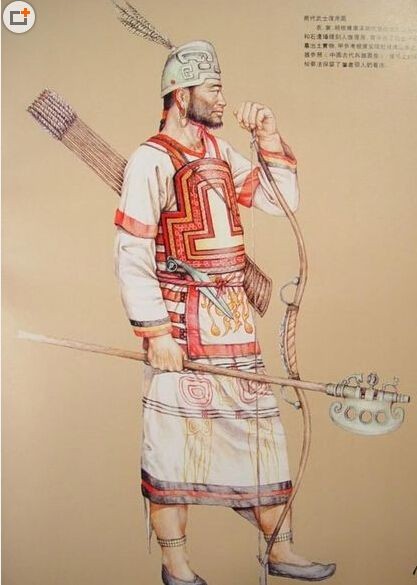 基本符合中国古代华夏民族上衣下长,束发右衽的装束特点。商朝时期的贵族男子往往头戴高巾帽、穿右衽交领窄袖衣、腰束绅带、佩带蔽膝。