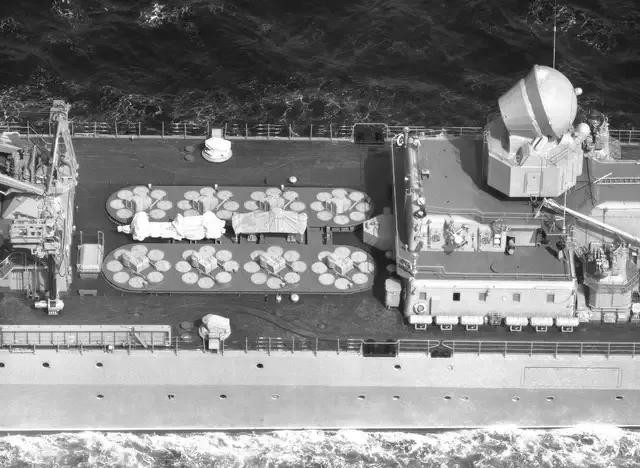 该舰素称“航母杀手”,在舰的两舷装有8座双联装SS-N-12远程超音速反舰导弹,共计16具,占据了主甲板上最耀眼的位置。SS-N-12导弹弹长11.7米,弹径0.88米,射程550千米,飞行速度2.5马赫,发射质量4800千克,战斗部重1000千克。舰上16枚SS-N-12导弹若进行连续发射形成的攻击,对敌航母和大型舰艇具有极大的威慑力。