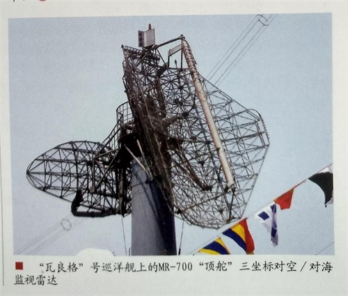 该舰上层建筑,雷达密布,有2座火控雷达,1部“顶板”捜索雷达,1部“前门”火控雷达。在塔桅顶端装有敌我识别器,在塔桅部还装有卫星通信天线。在中部上层建筑,设有另2部“椴木棰”火控雷达,在后桅杆上,另设有1部“顶对”对空搜索三坐标雷达。舰上安装的各种电子和通信设备,众多且数量很大,安装在舰的上层部位,就显得凌乱拥挤。