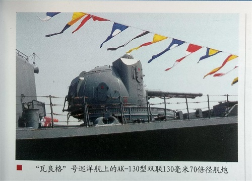 在“瓦良格”号的前甲板,装备1座AK130型火炮,该炮为全自动高平两用,用于对陆攻击。射速60发/分,射程23千米。在甲板上安装有6座AK-650型6管30mm炮用于末端防御,射程2千米,射速3000发/分。