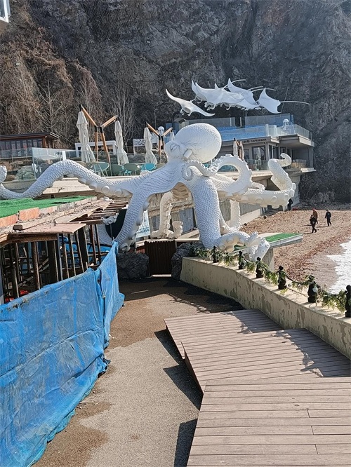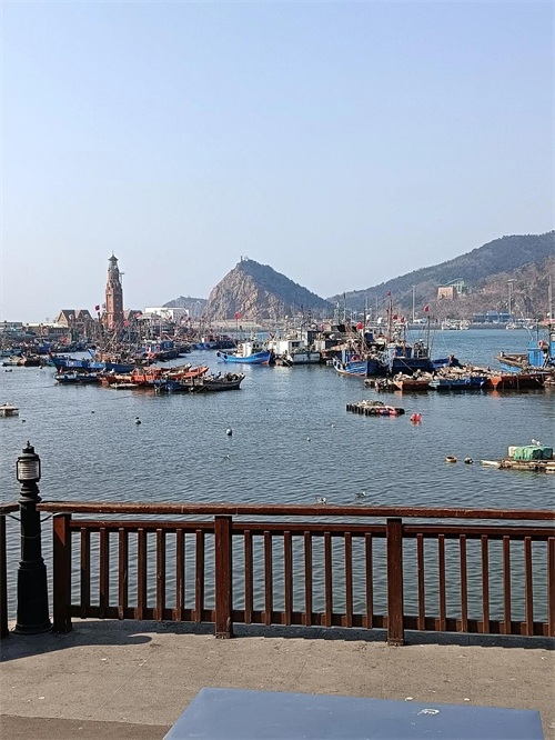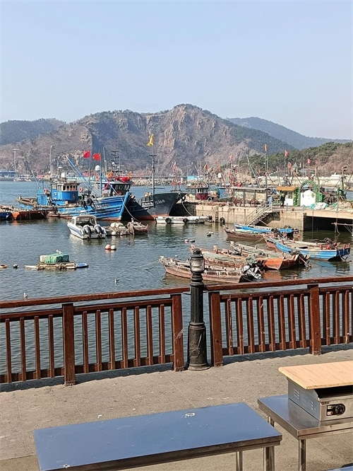 海湾内停满渔船和游艇,南侧280m长的栈道延伸至海中,船体上有海鲜烧烤摊和网红礼品店。