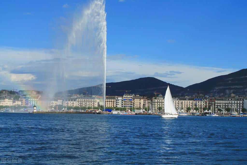 日内瓦湖清澈如镜,湖中喷射高度达140米高的大喷泉如一把闪光的长剑直冲云霄,人工美与自然美相映生辉。