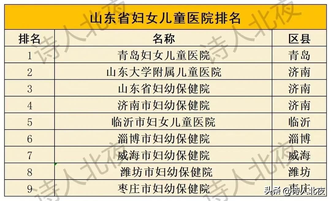 上述9所医院具体到每座城市:济南有3所上榜,是省内最多的城市;青岛、临沂、淄博、威海、潍坊、枣庄等6个地市均有1所上榜,其余城市妇幼医院暂未列入榜单。由此可见济南作为省会城市各类医疗资源相对比较集中;青岛市虽然只有1所,但是实力高居榜首,在国内也属于第一阵营水平。