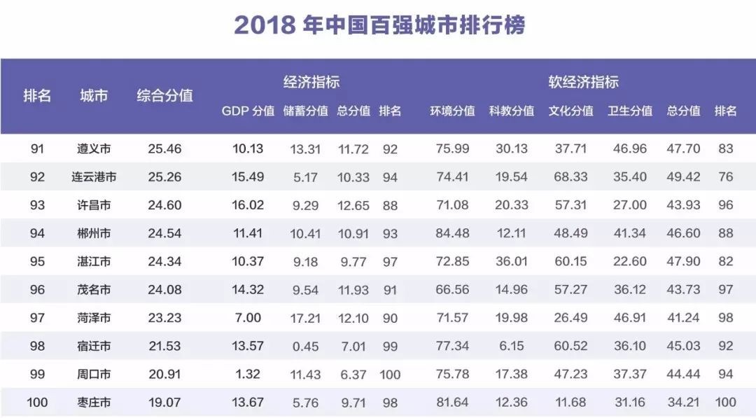 中国百强城市排行榜由经济和非经济(软经济)两大系列指标综合而成,数据来源于国家统计局。其中,经济指标由GDP(国内生产总值)和居民储蓄两部分构成,占比61.8%,非经济(软经济)指标由科教、文化、卫生、生态环境四部分构成,占比38.2%。