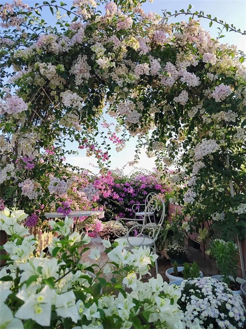 三角梅虽然不是严格意义上的爬藤植物,但通过牵引和修剪,可以让它攀附在篱笆院墙上。