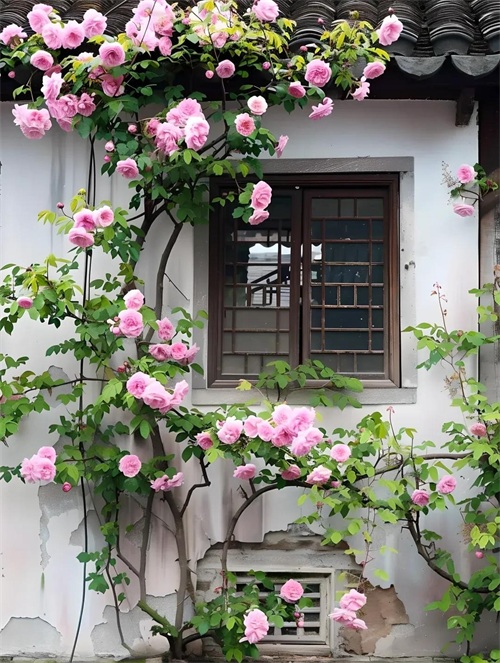 它的花朵小巧玲珑,颜色丰富多彩,有粉色、白色、红色等。蔷薇花盛开时,一片繁花似锦,仿佛给院墙披上了一层绚丽的花毯。