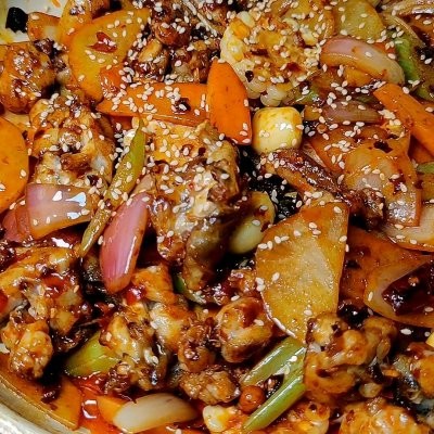 田鸡 3只盐 半匙胡椒粉 半匙生粉 1汤匙姜 4片独蒜 4个干辣椒 4个豆瓣酱 1匙老干妈 1匙
