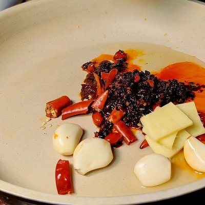 3、留底油下豆瓣酱,老干妈,蒜头姜片干辣椒爆香炒出红油