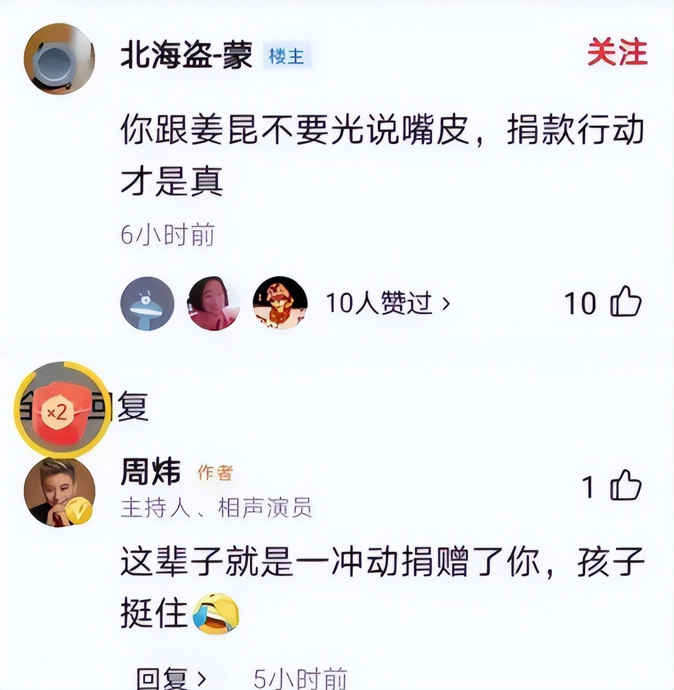 他回复网友“我捐了你啊”。