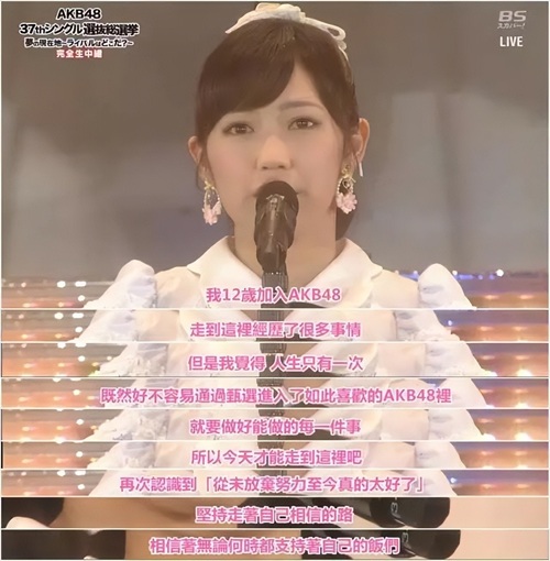 “我在两年前的演说中,立下了要成为第一的目标。去年没有实现,一时想中途放弃,但各位粉丝的温暖话语给了我冲击第一的决心。人生必须要有一次,尝试自己能做到的极限。这一天终于到来。当时没有放弃,能坚持下来,真是太好了。”——渡边麻友