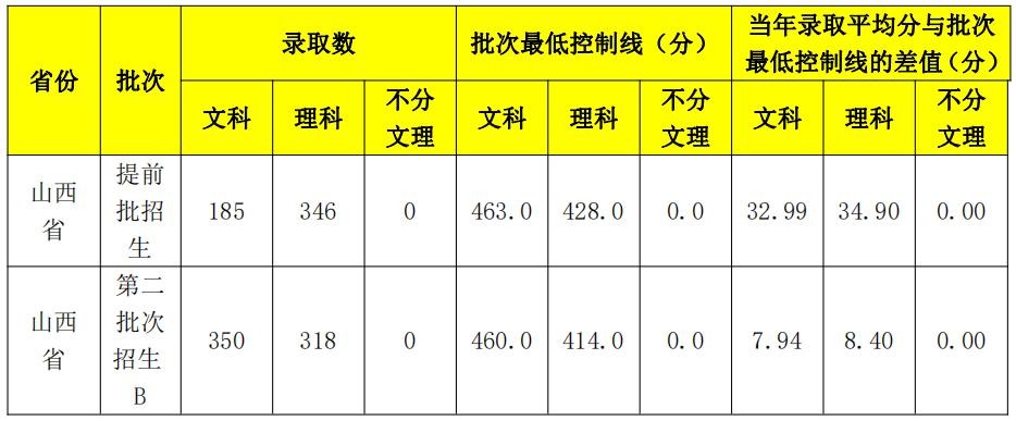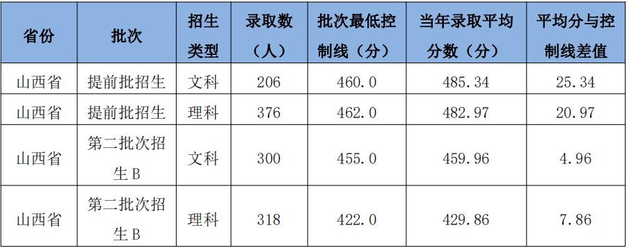 该校本科全部面向山西省招生。2021 年提前批次招生理科类录取平均分超出批次最低控制线 34.9 分,此项指标比 2020 年提高5.96 分;文史类录取平均分超出批次最低控制线 32.99 分,此项指标比 2020 年提高 5.57 分。2021 年本科生录取生源情况如下: