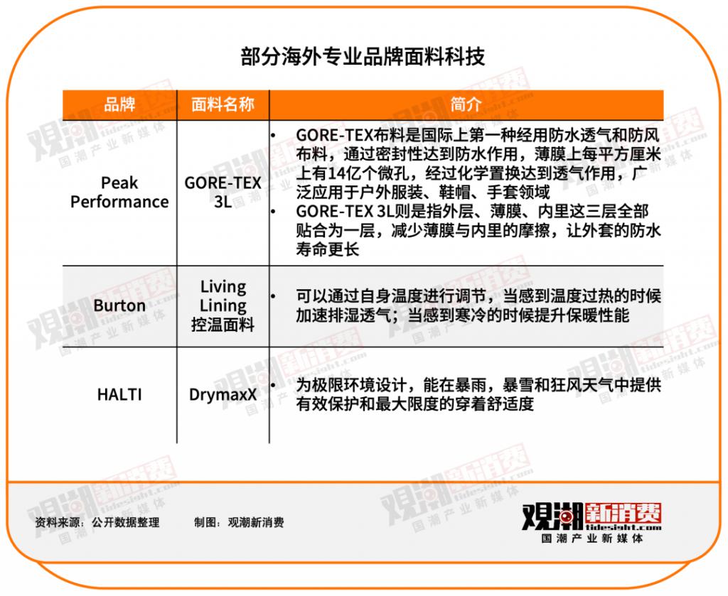 滑雪服不同于其他服装,对面料和工艺有极高的要求。海外专业品牌经过多年的沉淀与研发,在面料技术上更加成熟。