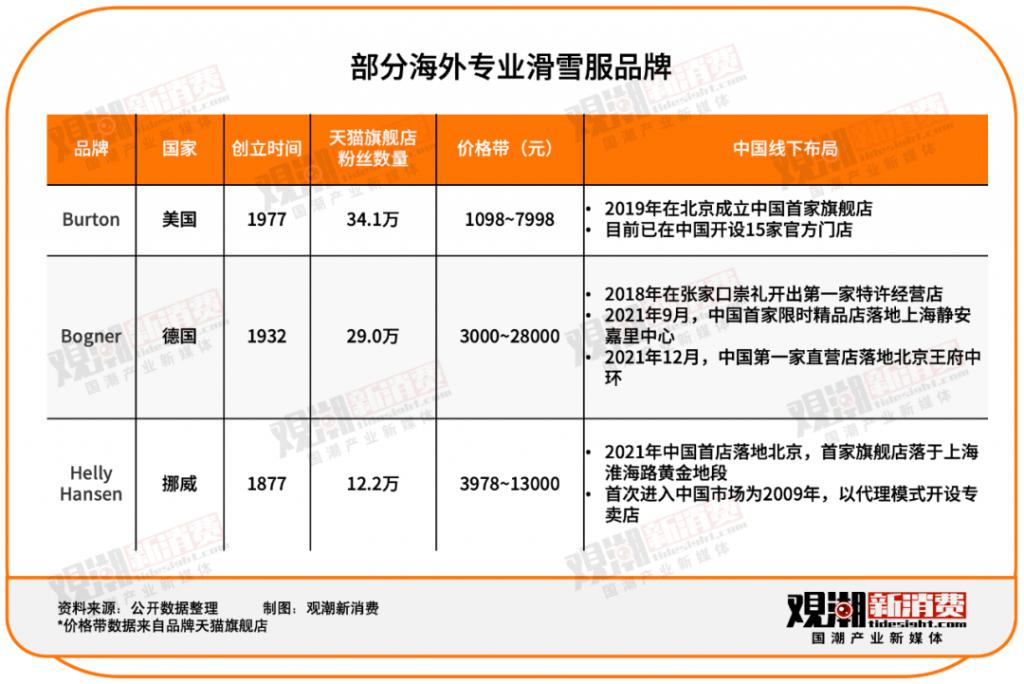 海外滑雪服品牌多是各个国家历史悠久,为国家队、奥运选手等人群服务的专业品牌,普遍以高端化为主,各大品牌价格均在千元以上,Bogner、Helly Hansen 最贵的滑雪服产品更是达到万元。从线下布局来看,这些品牌也是在 2018 年以后集中进入中国市场,在一线城市核心商圈、雪场附近开设门店。