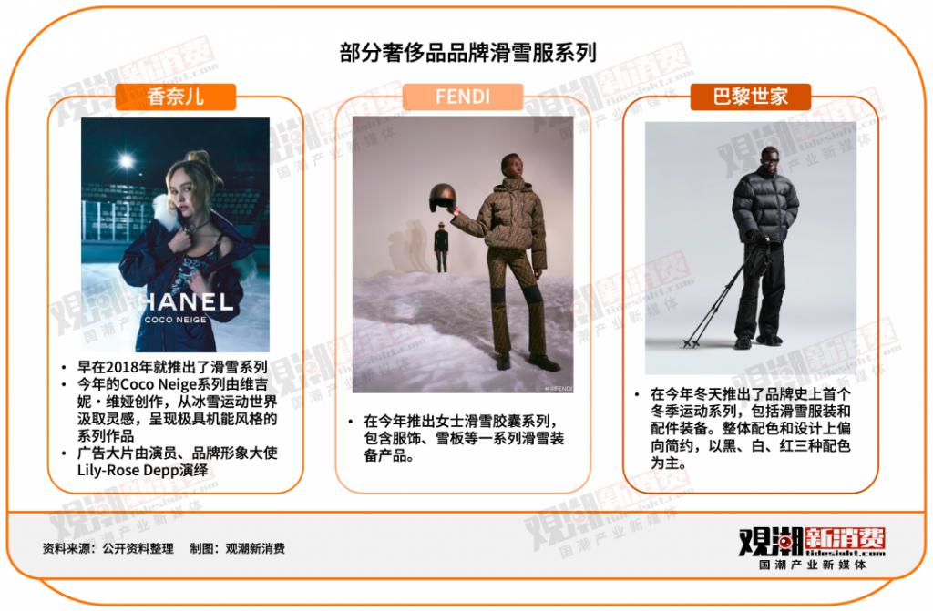 公众人物选择雪服作为日常搭配,不仅催生了大众的兴趣,更倒逼了滑雪服品牌设计的时尚化和日常化,也吸引了更多品牌跨界入局。奢侈品品牌作为时尚界的风向标,首先完成了雪系布局,香奈儿、FENDI、巴黎世家等大牌纷纷推出滑雪系列,通过独特设计和品牌影响力赢得市场关注。