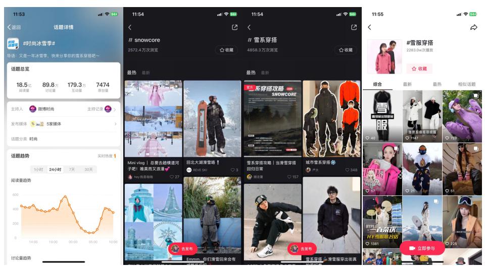 " 雪系穿搭 " 的出圈,最初离不开国内外时尚 icon 的助推,蕾哈娜、肯豆、易梦玲、虞书欣等纷纷在社交平台上晒出自己的 " 雪系穿搭 ","snowcore"(雪系时尚)的概念迅速在社交平台上走红。随着时尚圈红人的影响力扩大,雪服穿搭逐渐被大众熟知,微博、小红书等社交平台上 # 雪系穿搭 ##snowcore# 等话题收获了千万次的互动量。
