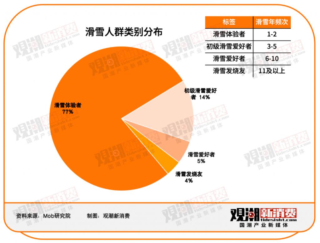消费群体的变迁也在同时发生。在北京冬奥会的助推之下,越来越多 " 初体验 " 的滑雪爱好者纷纷加入,滑雪从主要针对 " 有钱人 " 的 " 小众高端运动项目 ",向大众消费市场迁移。根据 Mob 研究院数据,我国滑雪人群中体验者占比近 8 成,每年滑雪 6 次以上的滑雪爱好者仅占比 8.7%。