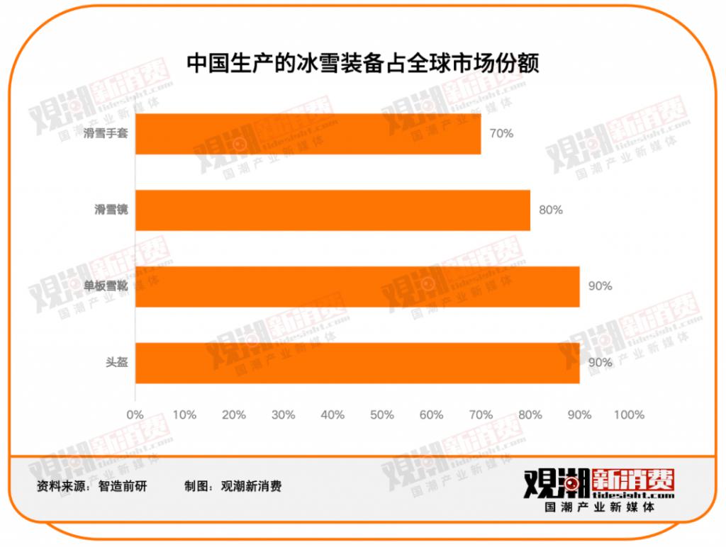 从供应链上来说,有数据显示,中国的贴牌代工支撑了全球超过 90% 的滑雪装备需求,山东、广东、福建等地都有十分完备的滑雪装备产业链,在滑雪手套、头盔等细分领域占据了全球最多 90% 的市场份额。