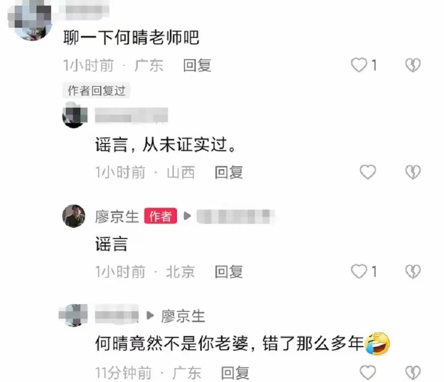 而在几年前,廖京生也曾在一篇有关他和何晴是夫妻文章下面辟谣,声称两人并不是一家人。