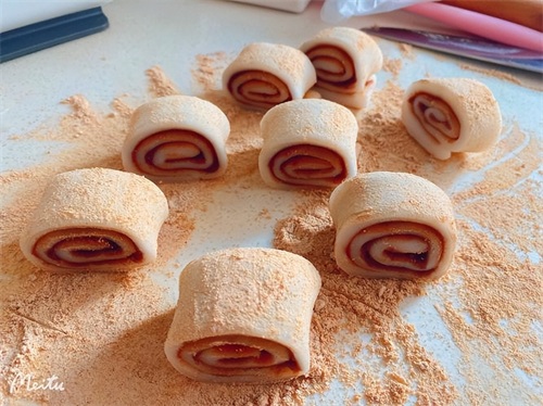 5.将红豆沙或红糖均匀地抹在面片上,并从一端开始卷起来,卷成一个长条。