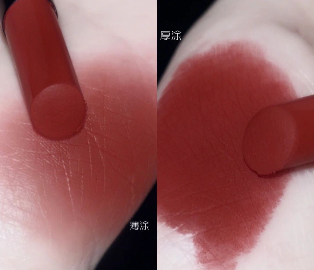 烟管质地薄,顺滑好涂,丝绒雾面质地,却又不拔干,超级温柔的红茶拿铁色,介于奶茶色跟土橘色之间的,配上这个高级的柔雾质地简直不能再高级了。