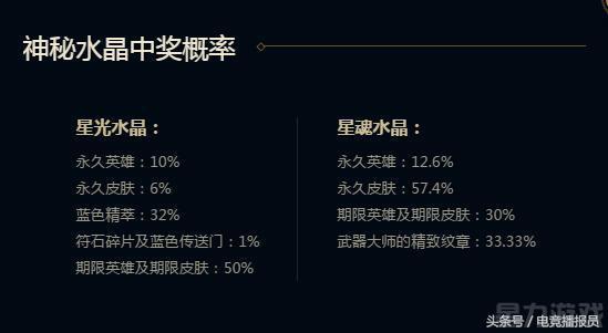 有意思的是,现在水晶中奖的概率也完全公示了出来(下图),可以看到,星魄水晶开出永久皮肤的概率高达57.4%,而星光水晶开到期限英雄及期限皮肤的概率达到了50%。