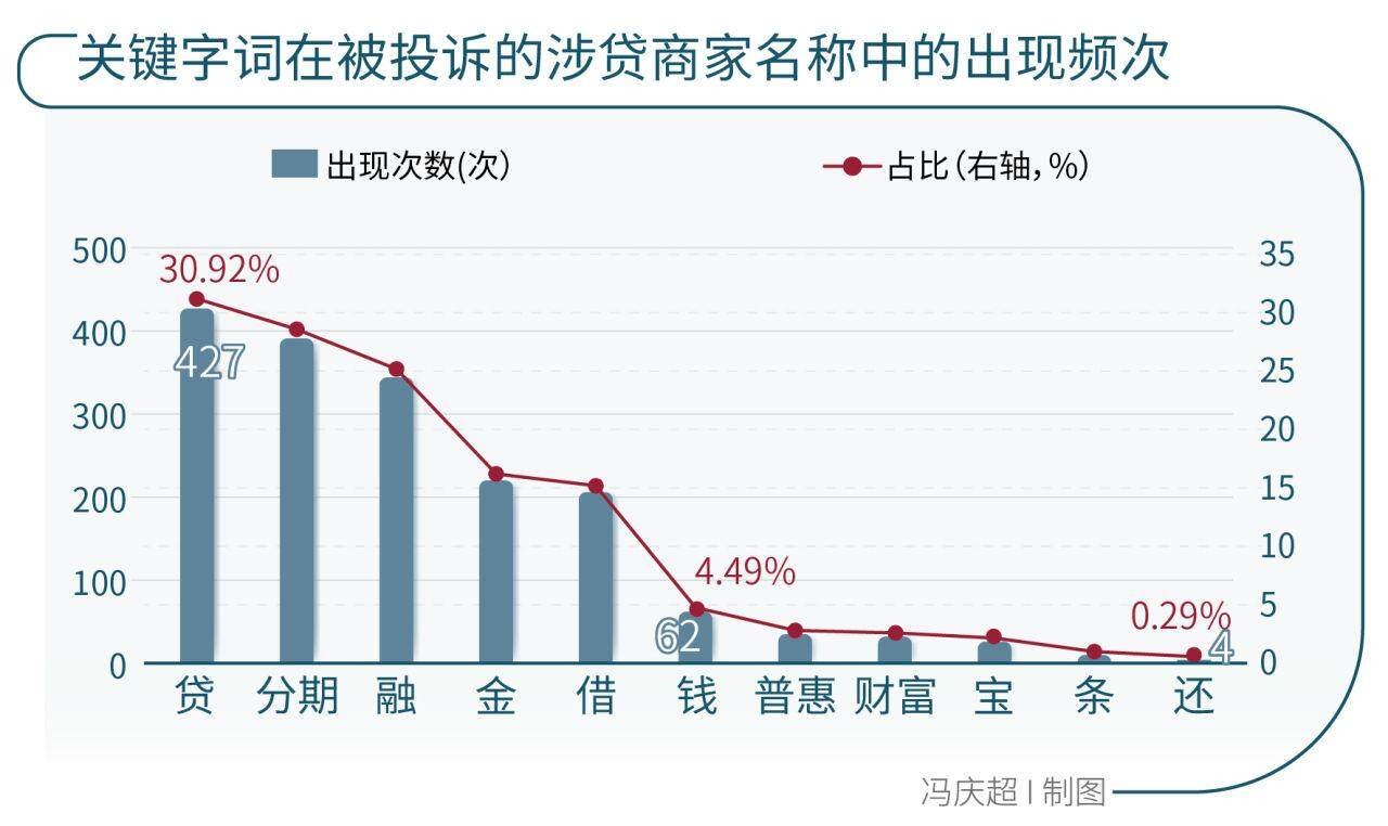 哪些字词最受“欢迎”?统计发现,名称中包含“贷”“分期”“融”的店家均超过300家位列前三,占比分别达到30.92%、28.31%和24.91%,“金”“借”出现的频数均超过200家,占比分别为15.93%和14.92%。以上5个关键字词的排列组合,合计覆盖了超过95%的“商家”,而其余6个关键字词出现的频度均不超过5%。