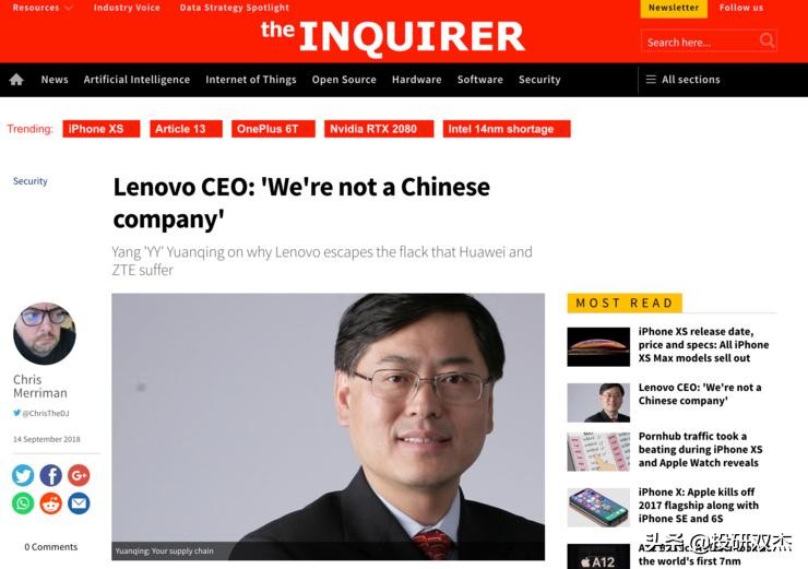 2018年9月14日,英国媒体《The Inquirer》发表了一篇标题为“Lenovo CEO: ‘We’re not a Chinese company’”的文章,一石激起千层浪。