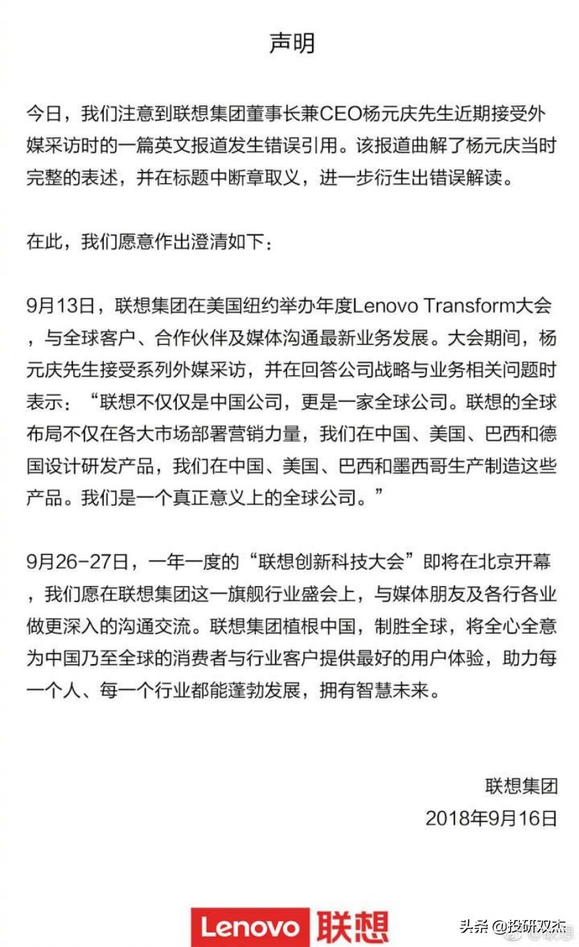 9月16日,联想集团连夜发布声明,表示英媒的报道“曲解了CEO杨元庆当时完整的表述,并在标题中断章取义,进一步衍生出错误解读”。
