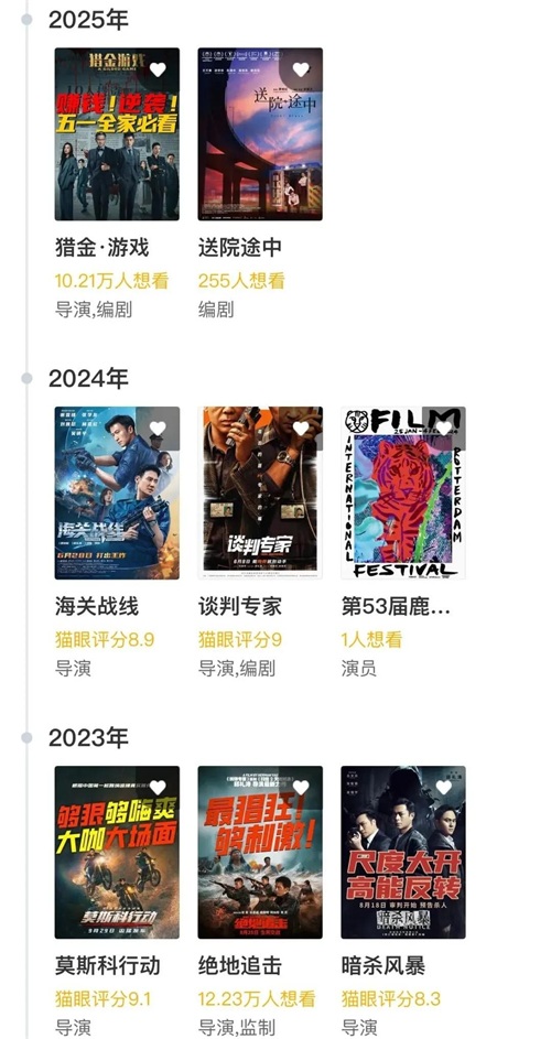包括《猎金游戏》在内,从2023年暑期档《扫毒3:人在天涯》算起,邱礼涛两年里上映了7部电影(仔细核对几次才确认,平均每年3部半),而且根据豆瓣影人主页显示,2025年他还有6部待映(包括《拆弹专家3》《反恐行动》《猎毒》《卫斯理》等),全都署名导演一职(意味着要亲力亲为),产量之高,令人咋舌——这不是拍电影搞艺术,而是“皮革厂老板黄鹤带着小姨子跑路”后疯狂大甩卖的节奏!