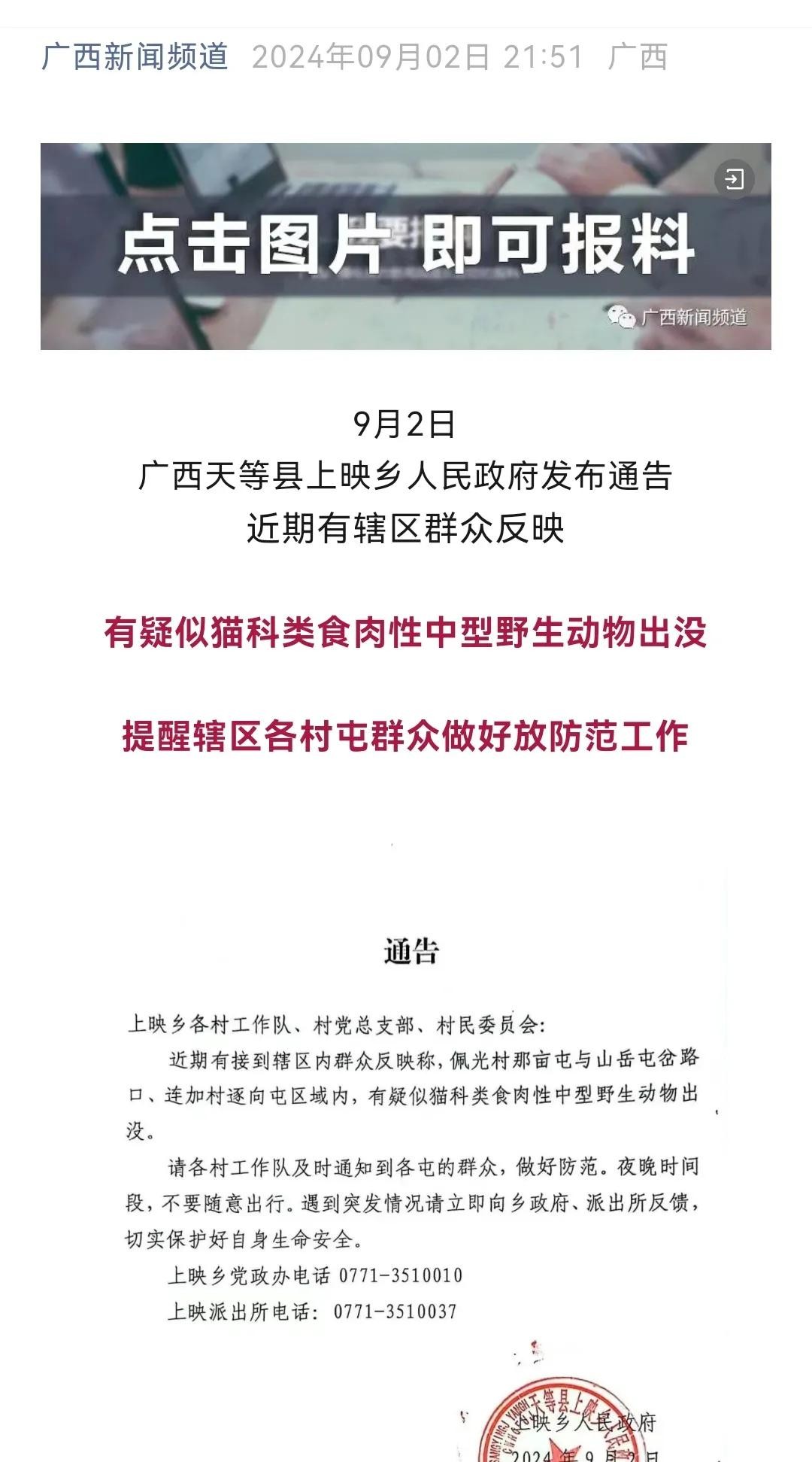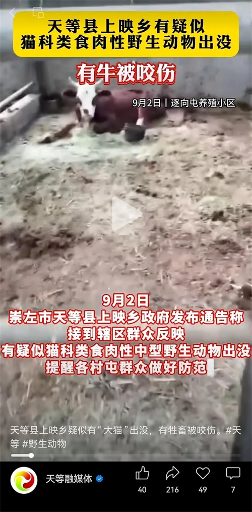 据广西新闻网和崇左市天等县融媒体9月2日报道,位于广西与越南接壤的崇左市天等县上映乡发现有疑似猫科类肉性中型野生动物出没,并咬伤牲畜。该乡人民政府发出公告提醒辖区群众夜间时段不要随意出行,并要求做好防范措施。当地部分群众和网友怀疑是在当地已经灭绝几十年的华南虎出现。目前,天等县正在组织人员开展排查和走访工作,具体情况以官方正式公告为准。同时也提醒天等县上映乡及周边群众近期关好门窗,切勿夜间时段出行。