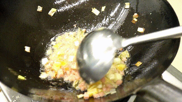 锅内烧油,油温五成热时倒入葱蒜炸香。再放入切好的火腿和变蛋翻炒一会。