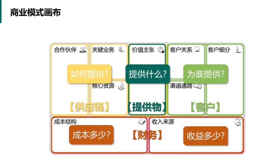 由这四个视角延展到9个核心要素,也就是商业模式9个基本要素:客户细分、价值主张、渠道通路、客户关系、收入来源、核心资源、关键业务、重要合作、成本结构,形成了商业模式画布。