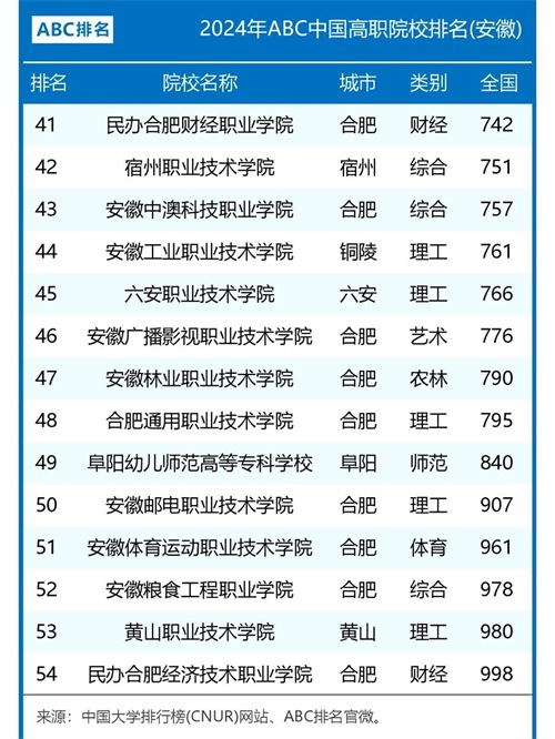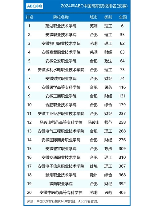 最新!2024安徽省专科院校排行榜
