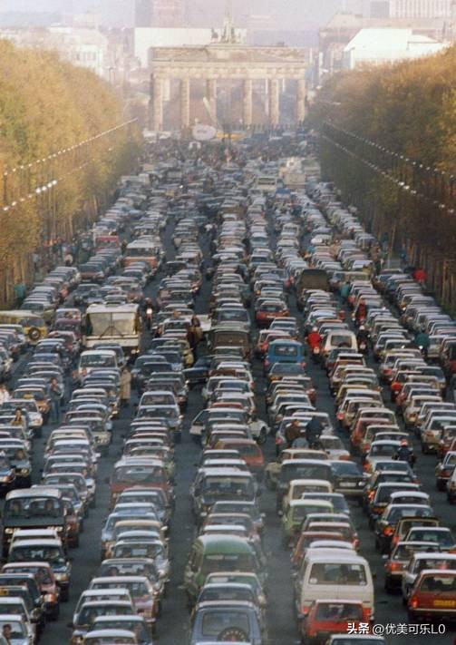 40、1989年11月,当东德政府宣布,同意开放边境地区后,前往西德的路上,堵满了各式各样的汽车。以前只能在柏林墙附近观察西德的人们,迫不及待地开着车,想要前往西德,亲自体验一下只有一墙之隔的,另外一个国家的生活。