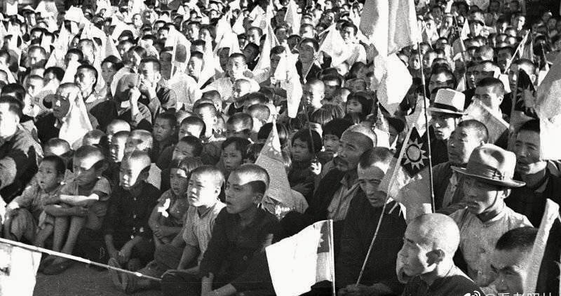 39、1945年,东北人民举行集会欢迎苏军。其中民众中有很多朝鲜侨民打着太极旗。
