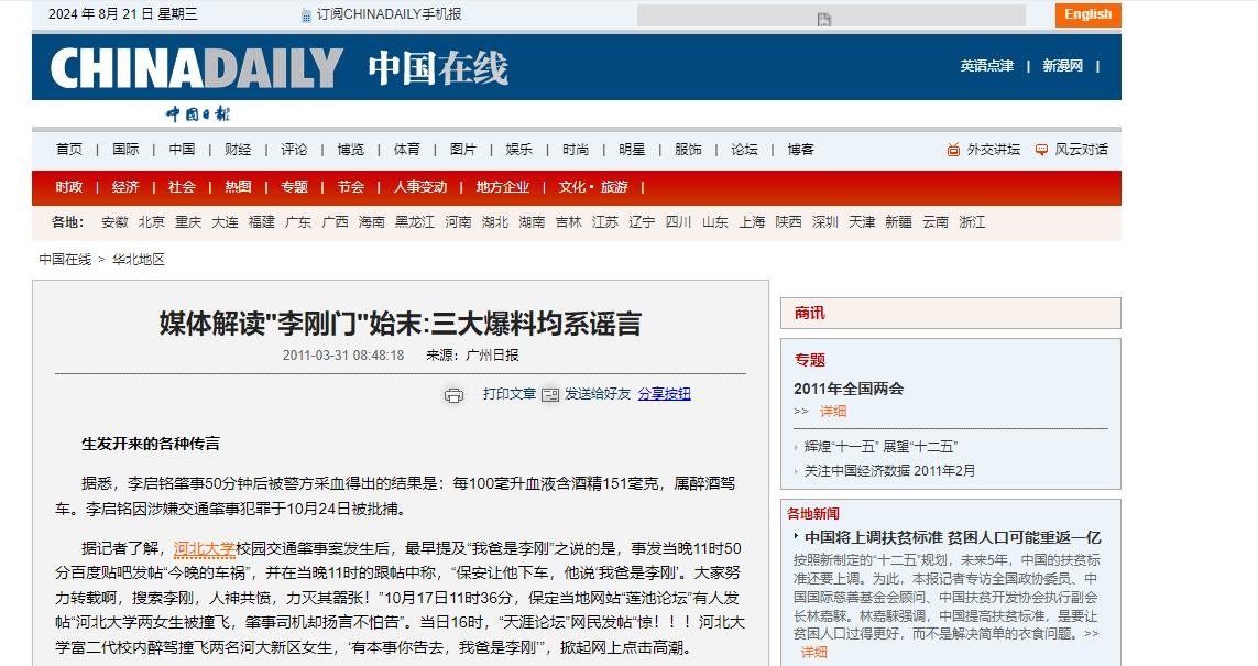 中国日报:《媒体解读"李刚门"始末:三大爆料均系谣言》
