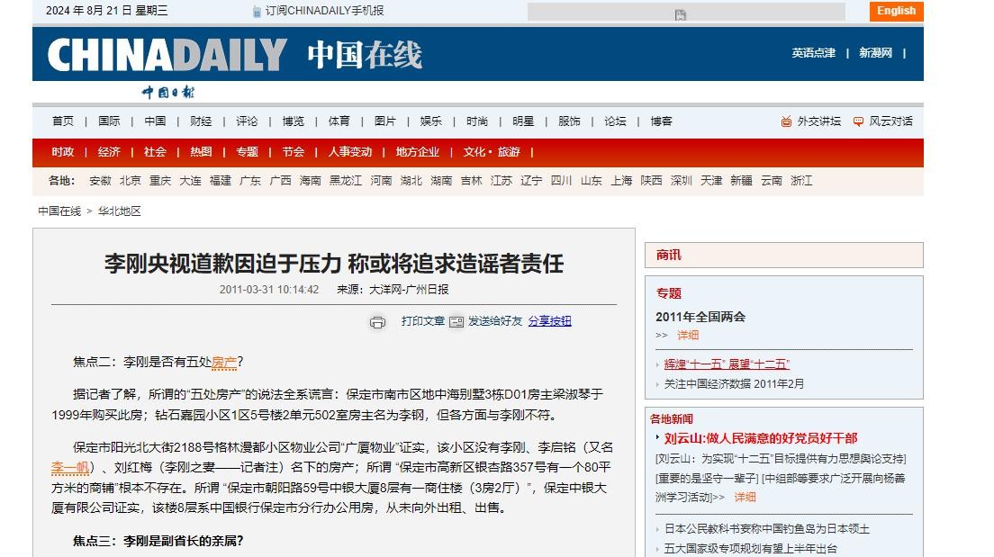 中国日报:《李刚央视道歉因迫于压力 称或将追求造谣者责任》