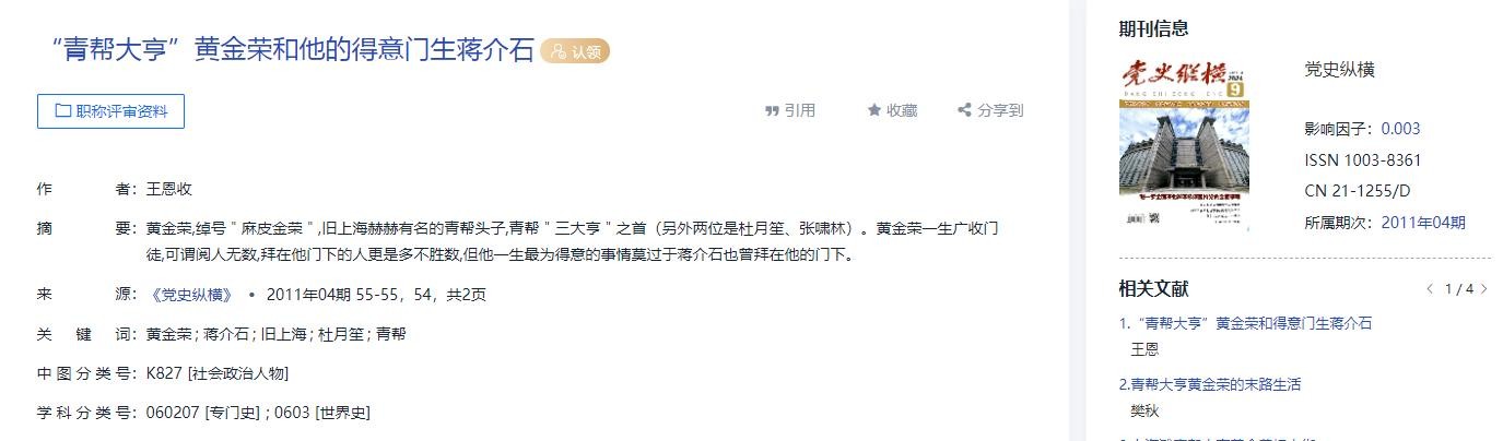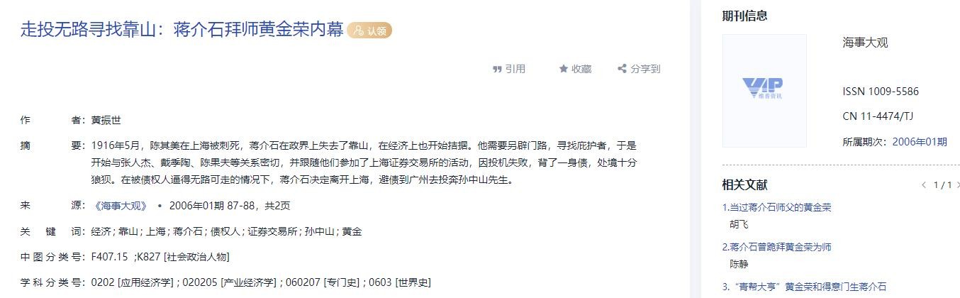 3.黄振世.走投无路寻找靠山:蒋介石拜师黄金荣内幕[J].海事大观,2006,18(01):87-88.
