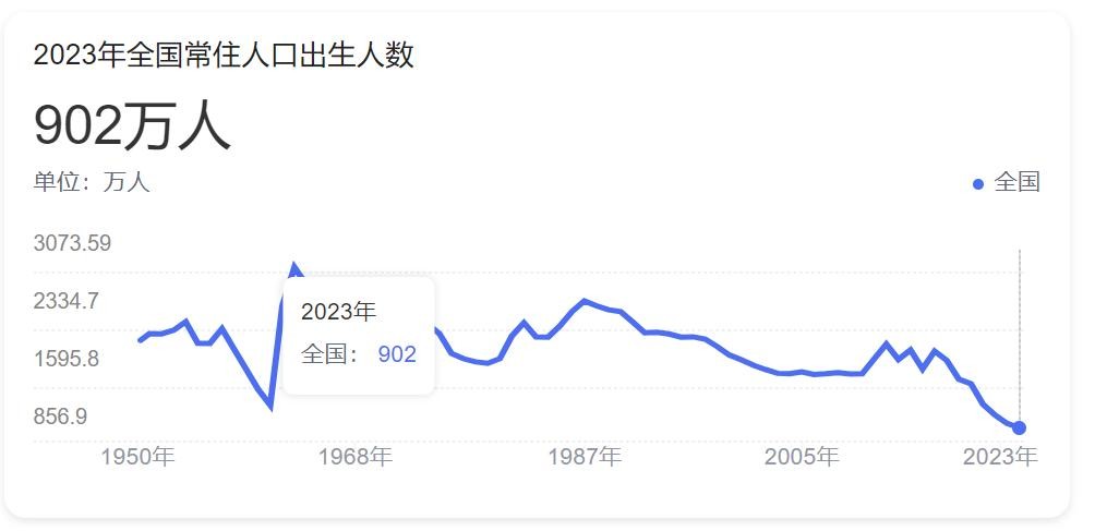 众所周知,从2016年开始,中国生育率就不断下降,2023年出生人口902万,相比16年高峰时期,减少了近一半。
