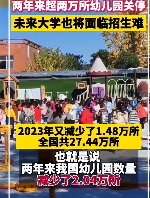 同样的例子还发生在幼儿园的身上。2022年,中国幼儿园数量是28.92万所,比上一年减少5160所,下降1.9%,这是08年来幼儿园数量的首次负增长。而2023年又比2022年减少1.48万所。