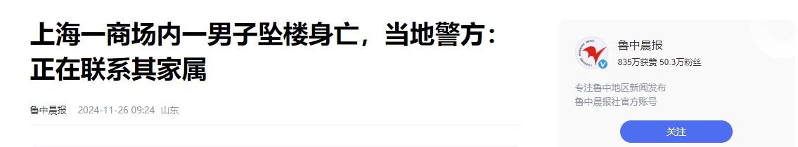 鲁中晨报——上海一商场内一男子坠楼身亡,当地警方:正在联系其家属