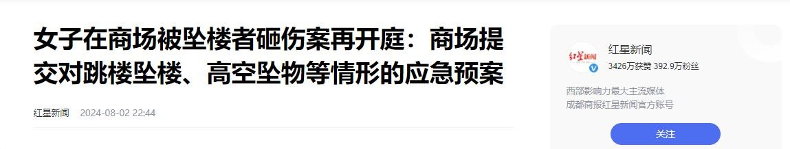 红星新闻——女子在商场被坠楼者砸伤案再开庭:商场提交对跳楼坠楼、高空坠物等情形的应急预案