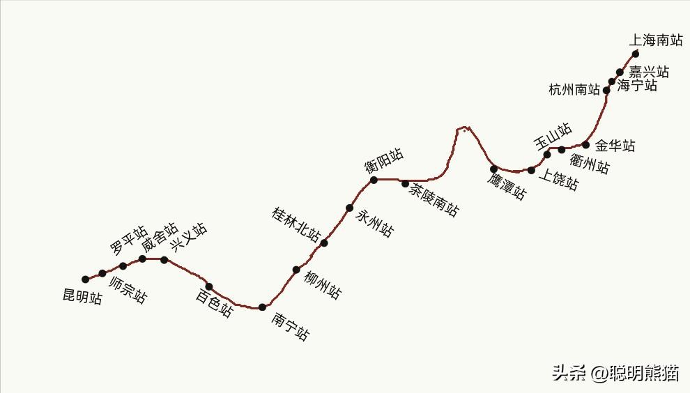 综上所述,本次列车全程运行2872千米,用时39小时18分,平均速度73.0800千米/小时。如果减去列车停靠车站167分钟,列车平均速度约78.6480千米/小时,列车途经上海市、浙江省、江西省、湖南省、广西壮族自治区、云南省等五省市一自治区,列车停靠上海南站、嘉兴站、海宁站、杭州南站、金华站、衢州站、玉山站、上饶站、鹰潭站、茶陵南站、衡阳站、永州站、桂林北站、柳州站、南宁站、百色站、兴义站、威舍站、罗平站、师宗站、昆明站等二十一座车站