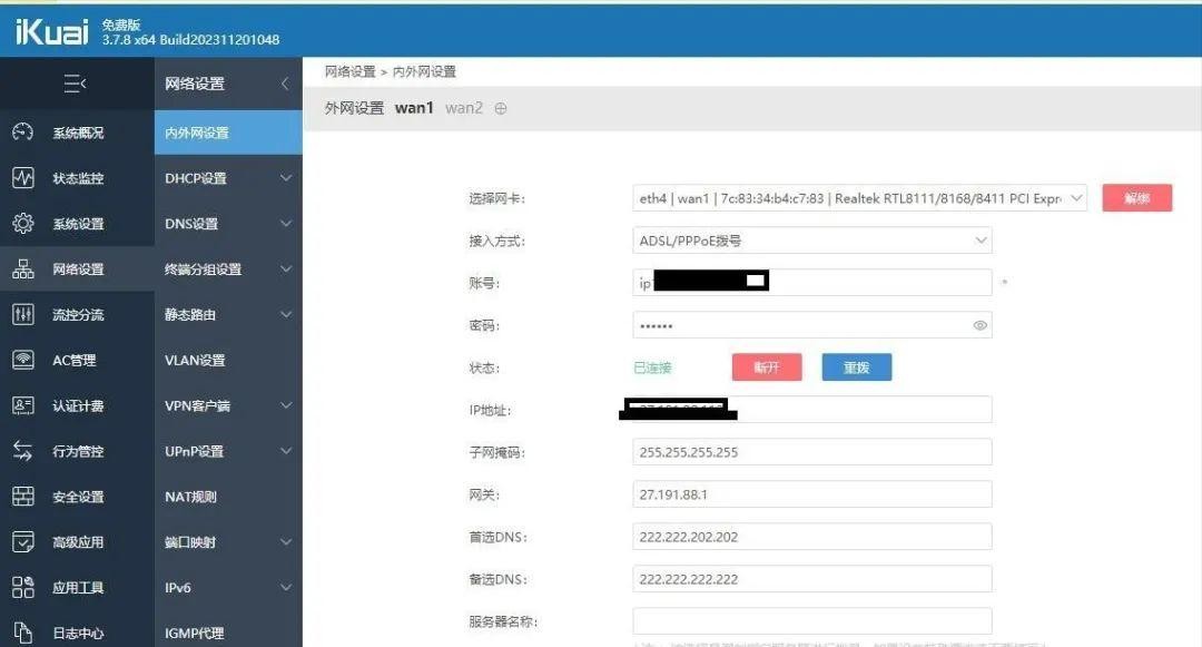 爱快WAN1用来上网,我之前已经将光猫上网口改了桥接,所以选的拨号。如果你不会改桥接,用DHCP也可以。