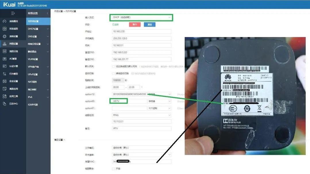 爱快WAN2用来走IPTV,设置DHCP,,页面上的option12填写机顶盒的STBID,option60填写 HEITV(河北电信专属的,其他省份自己抓包也能找到)。然后点开下面的高级设置,把盒子的MAC地址填到MAC地址模拟这里。填完后保存,这时候WAN2就能成功获取IP地址了。